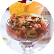 Fresh shrimp marinated in citrus juice, mixed with onions, tomatoes, cilantro, jalapeño pepper and chopped avocado.