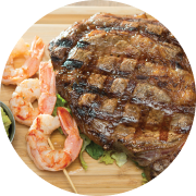 Superior Angus Rib Eye. Served with grilled shrimp, Mexican rice, pico de gallo and guacamole.