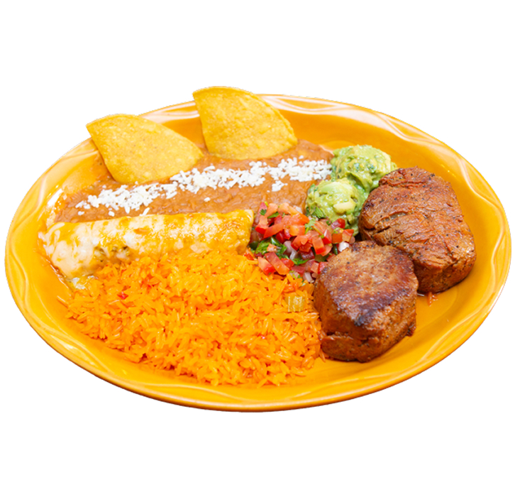 Three soft corn Tortillas immersed in guajillo sauce and grilled, filled with charbroiled angus sirloin steak, crowned with cheese, cilantro and red onions. Served with refried beans, homemade guacamole, fresh lime and mild tomatillo sauce.