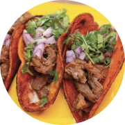 Three soft corn Tortillas immersed in guajillo sauce and grilled, filled with charbroiled angus sirloin steak, crowned with cheese, cilantro and red onions. Served with refried beans, homemade guacamole, fresh lime and mild tomatillo sauce.